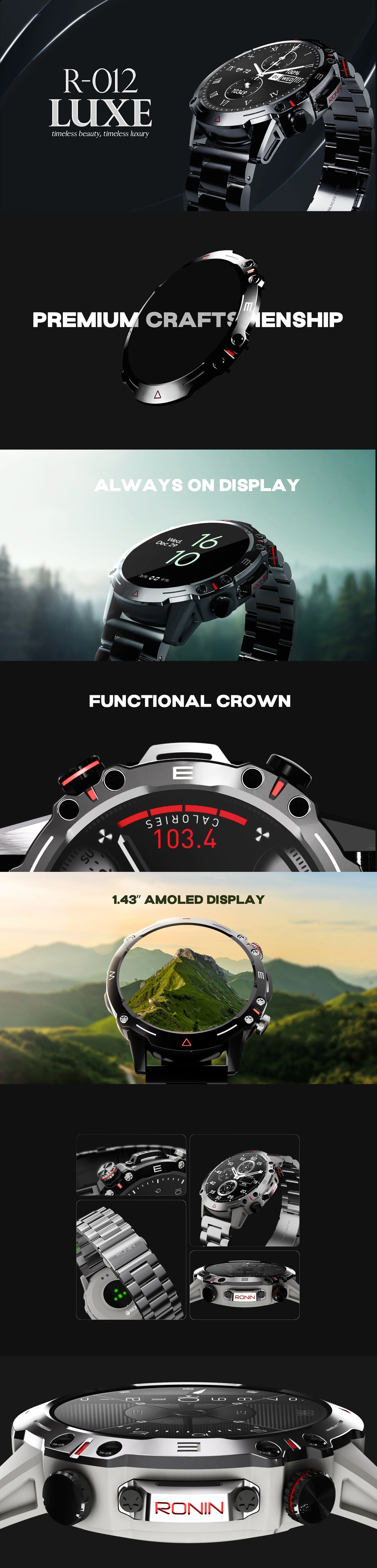 The R-012 LUXE Smart Watch offers a 1.43-inch AMOLED display with Always-On mode, delivering a luxurious design and advanced features for everyday style, health tracking, and smart connectivity.